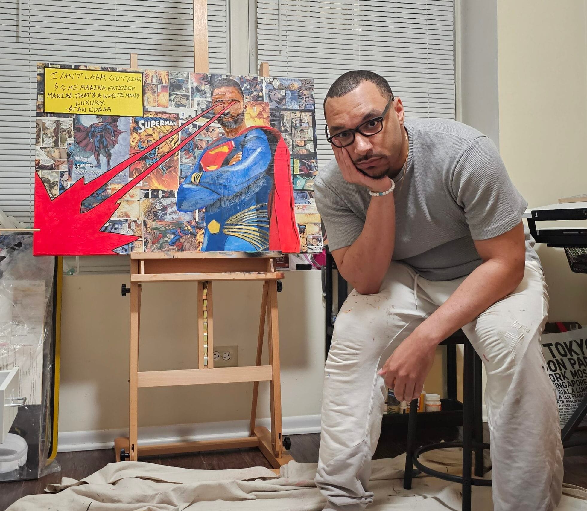My work ranges from portraiture and collage exploring the Black community’s relationship with popular media (manga, anime, comic books) to colorful illustrative paintings of characters experiencing varying degrees of saddening situations.