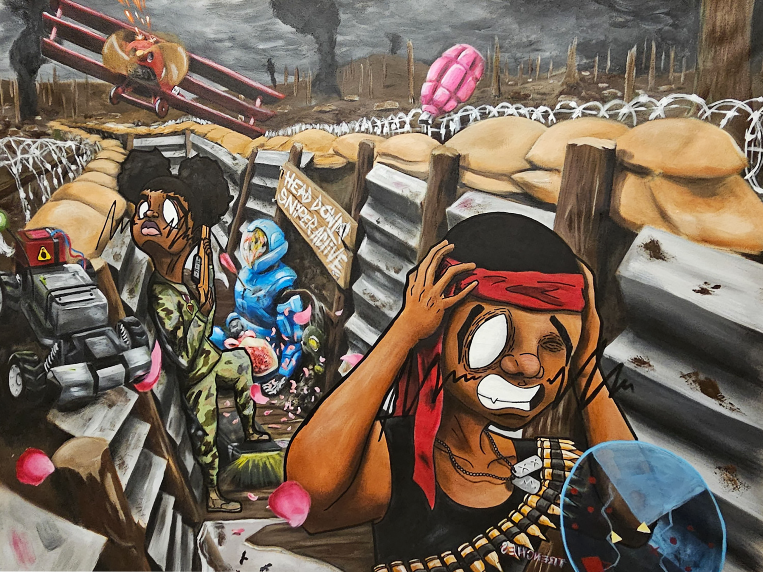 + ShippingA flagship Mind Games piece. Approx 60 in x 48 in acrylic paint on canvas. Will ship rolled and unstretched with excess canvas untrimmed for stretching or this excess can be trimmed for framing,