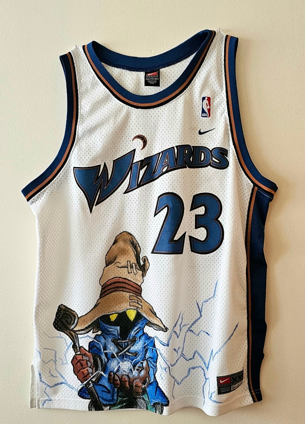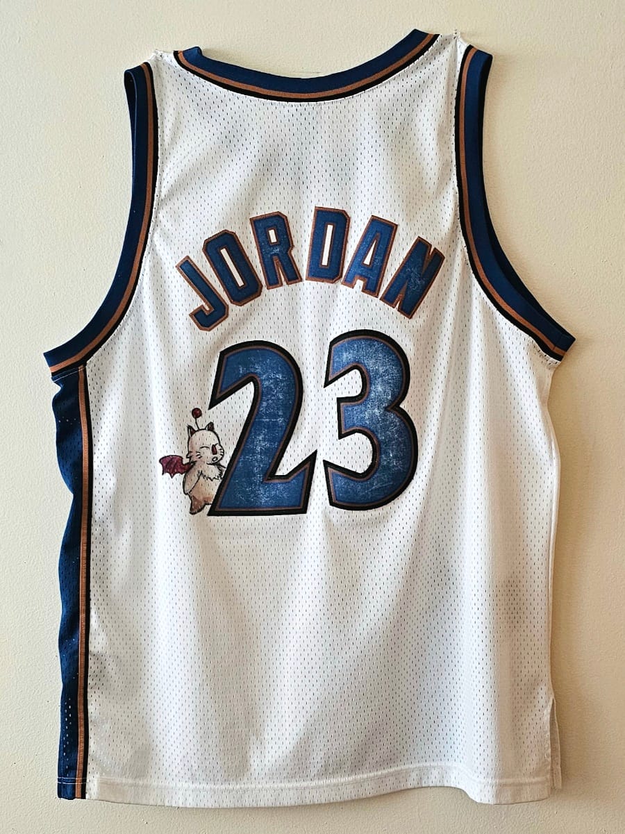 A custom painted vintage XXL Jordan Washington Wizards Jersey featuring Vivi, the black mage from Final Fantasy IX, and a Moogle on the back.