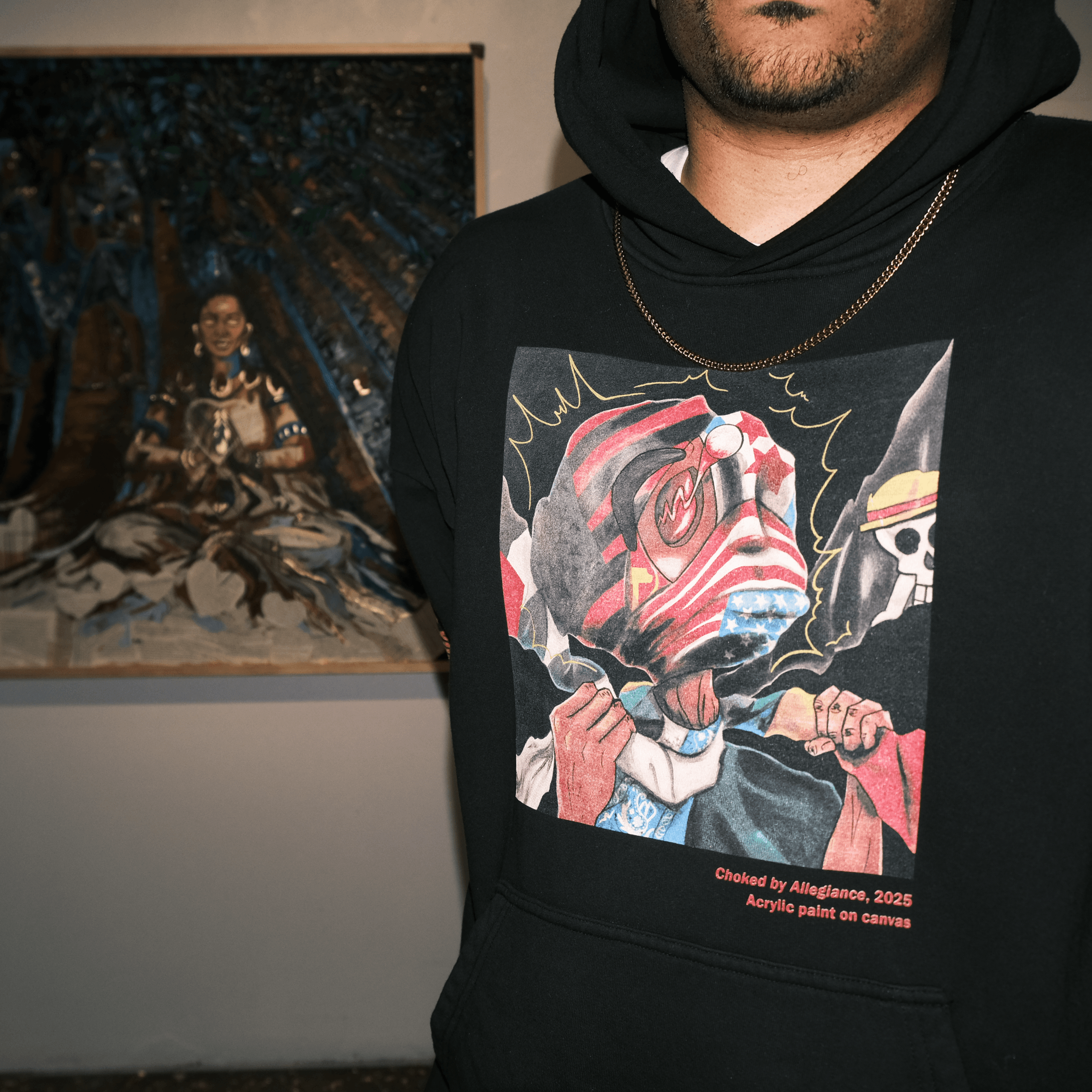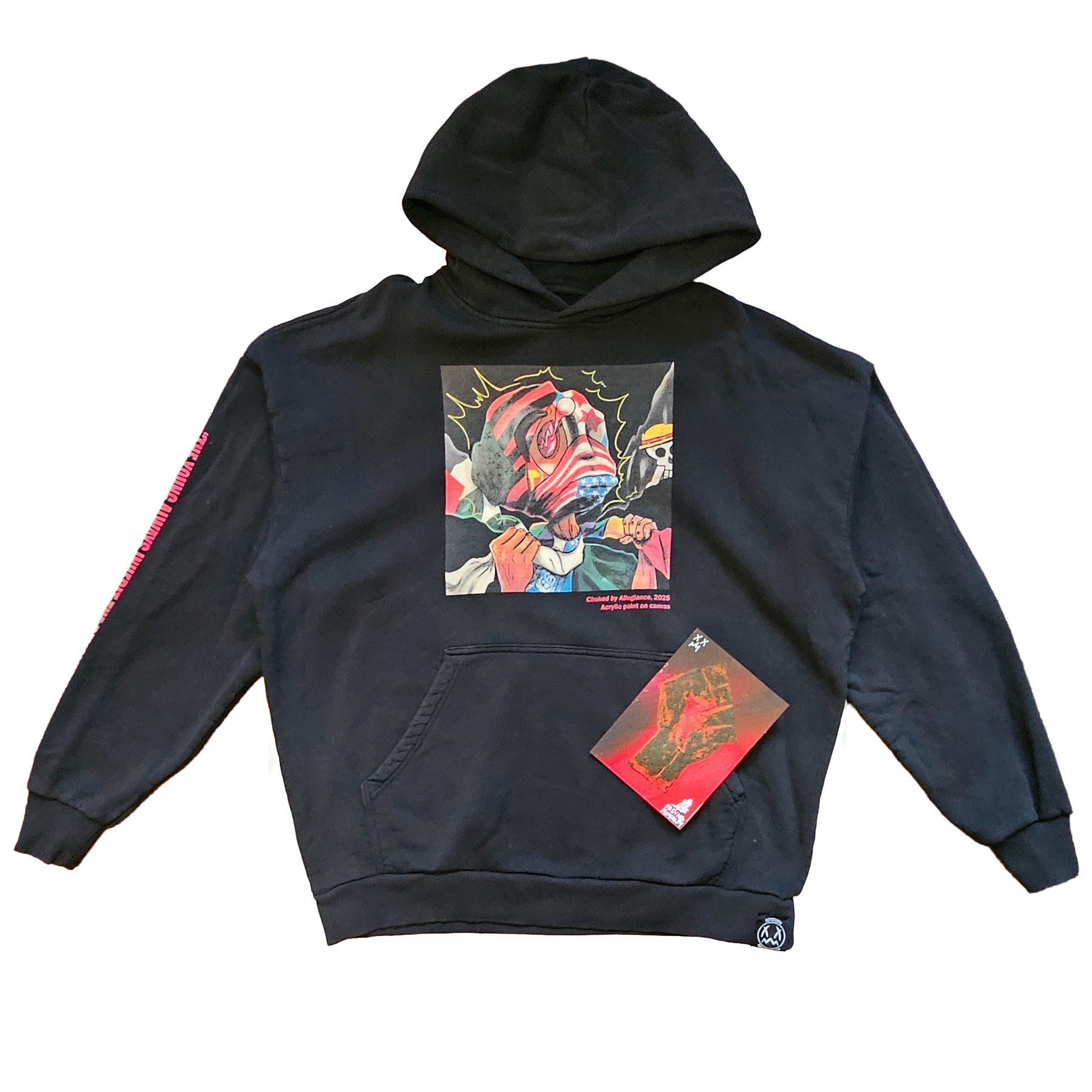 + ShippingA heavyweight 10oz oversized fit hoodie featuring “Choked By Allegiance” by Anthony Bartley on the front, and the quote “The young always inherit the revolution” – Huey P Newton on the right sleeve. Each hoodie always comes with an original 5 in x 7 in linocut print of a raised fist.