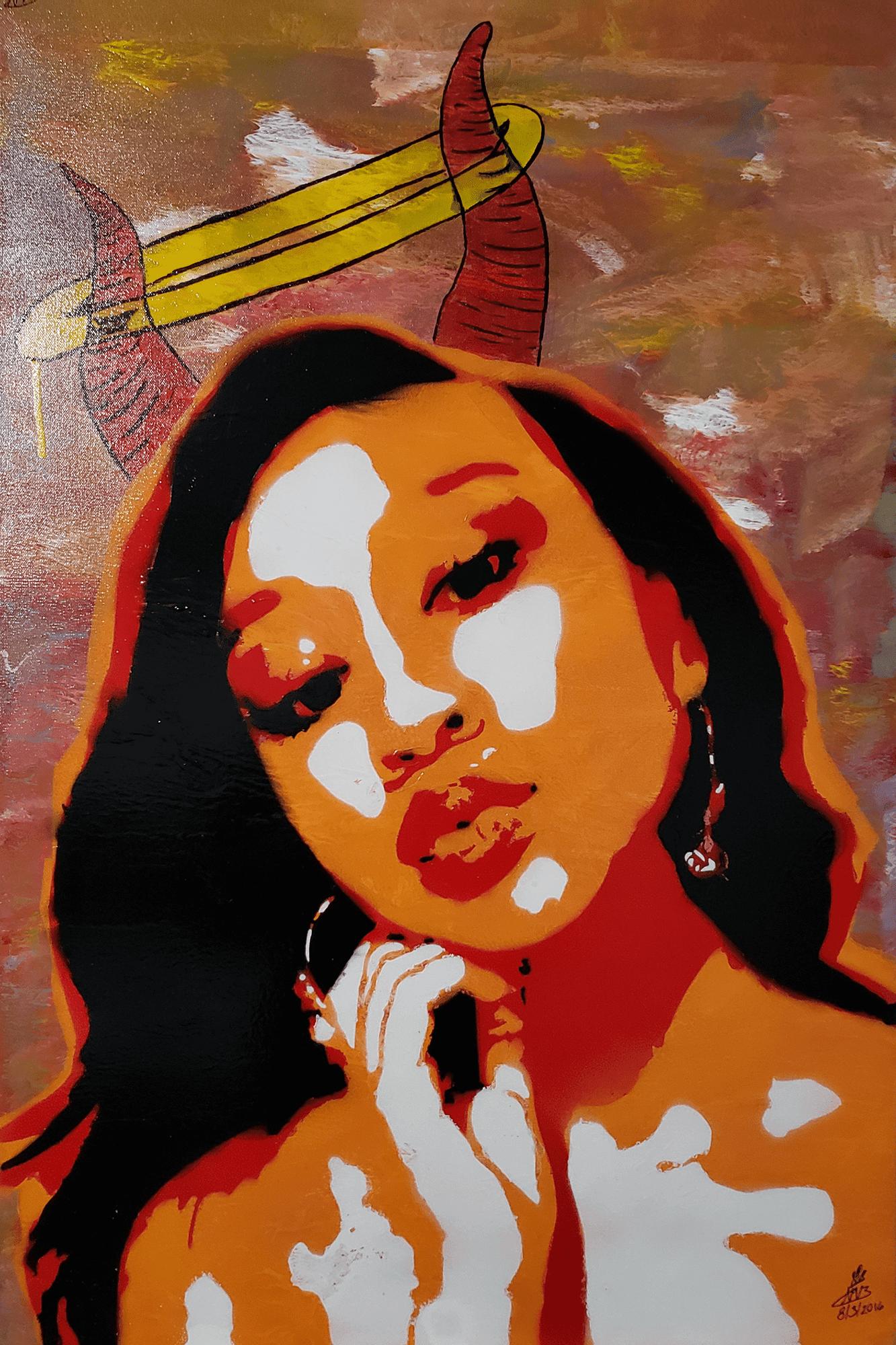 + ShippingHalo and Horns is a 24 in x 36 in painting inspired by Silence by Mike Posner (ft. Labyrinth). This painting is acrylic and spray paint on canvas. This work was completed in 2017. Please note that this painting has a depth of 1.5 in.