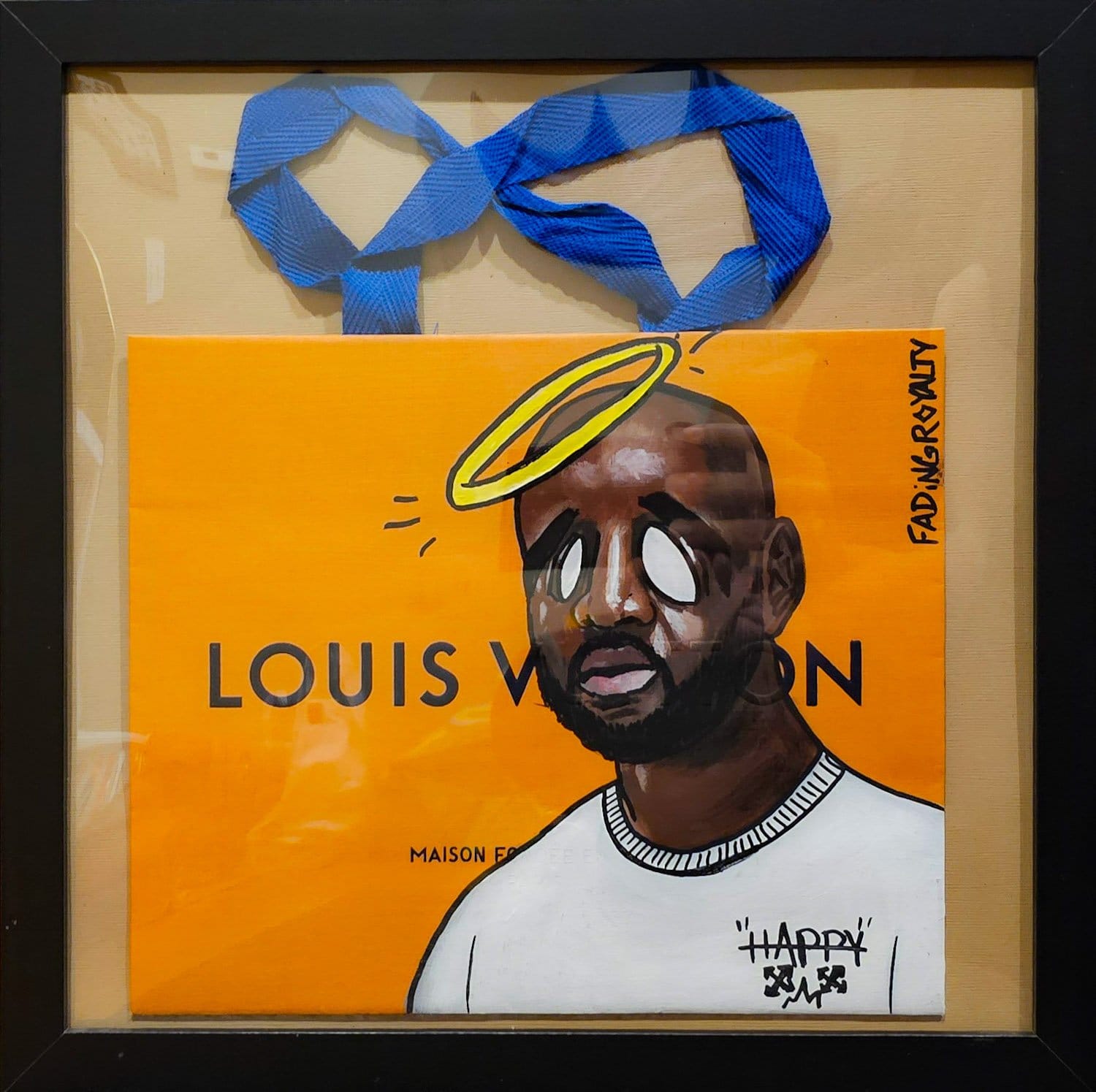 A framed gouache illustration of Virgil Abloh on a Louis Vuitton shopping bag by Anthony Bartley. The frame measures 12 in x 12 in.