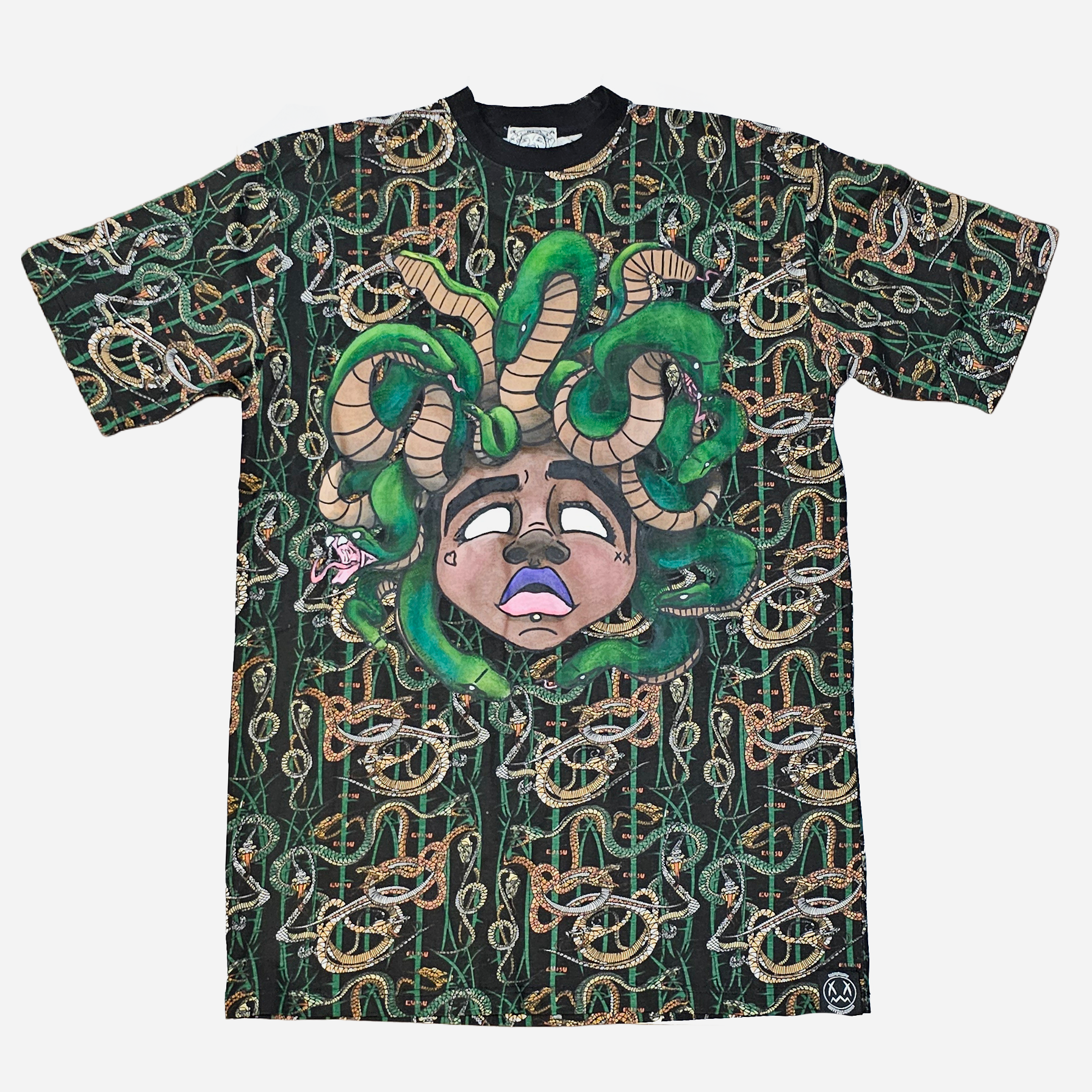 An original painting on vintage Evisu all over snake print tee. Size XL.